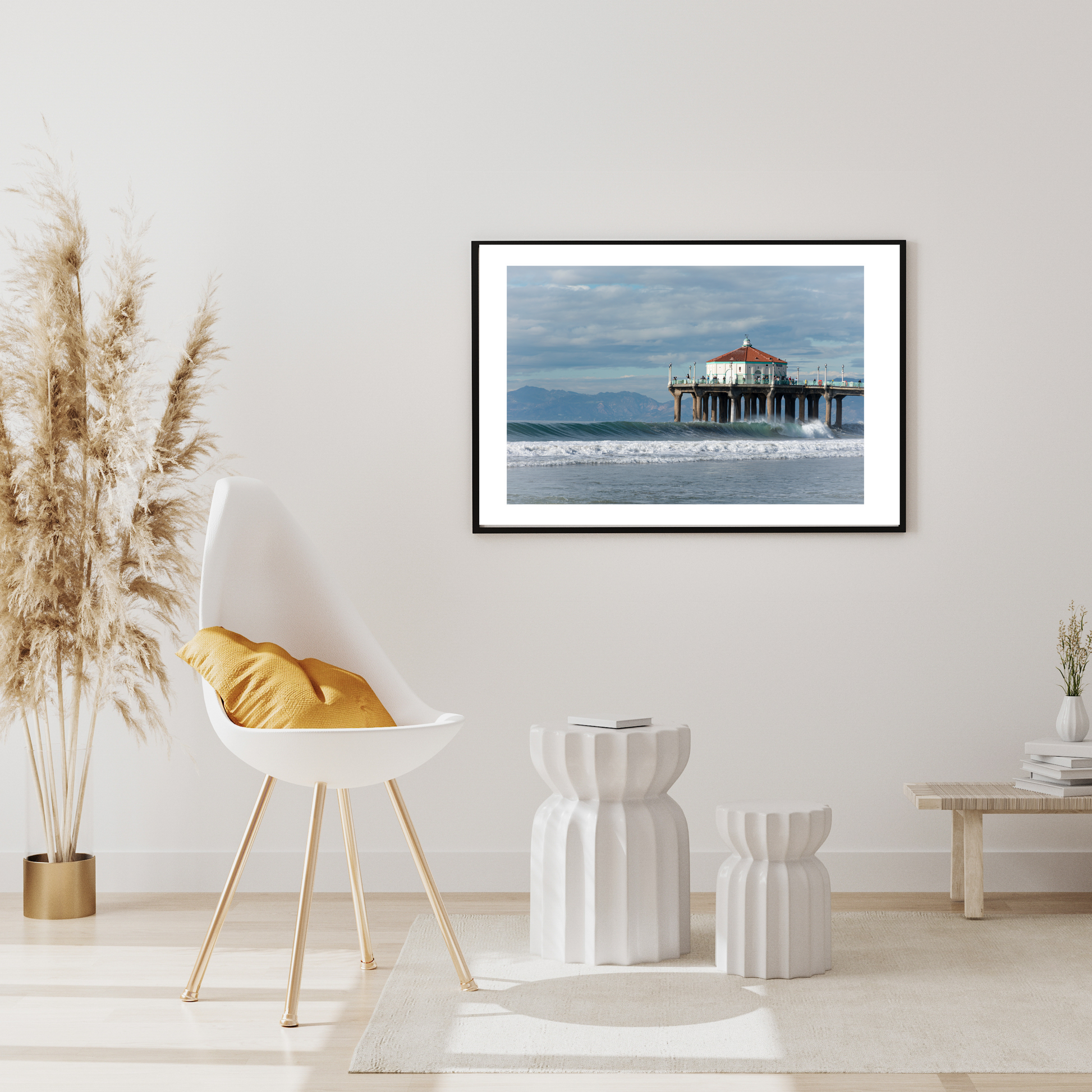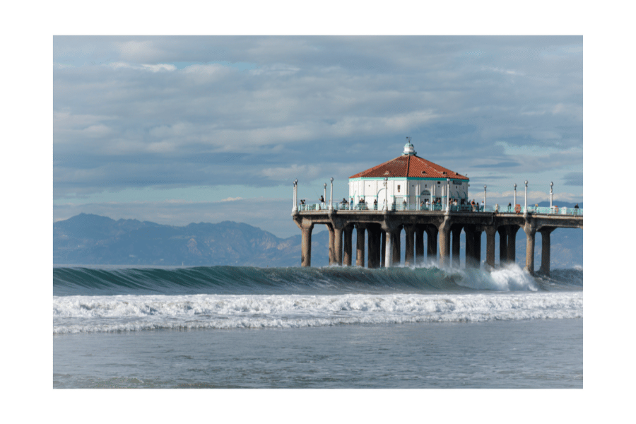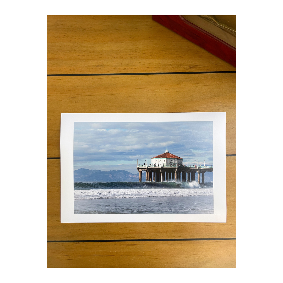 California wall art for the ocean lover, "Incoming," features a wave rolling into the Manhattan Beach Pier on a clear day with the Santa Monica mountains in the background. It's a limited edition photograph, with only 250 prints available in each of two sizes (12"x8" and 18"x12"). Once they're gone, this print won't be sold again.