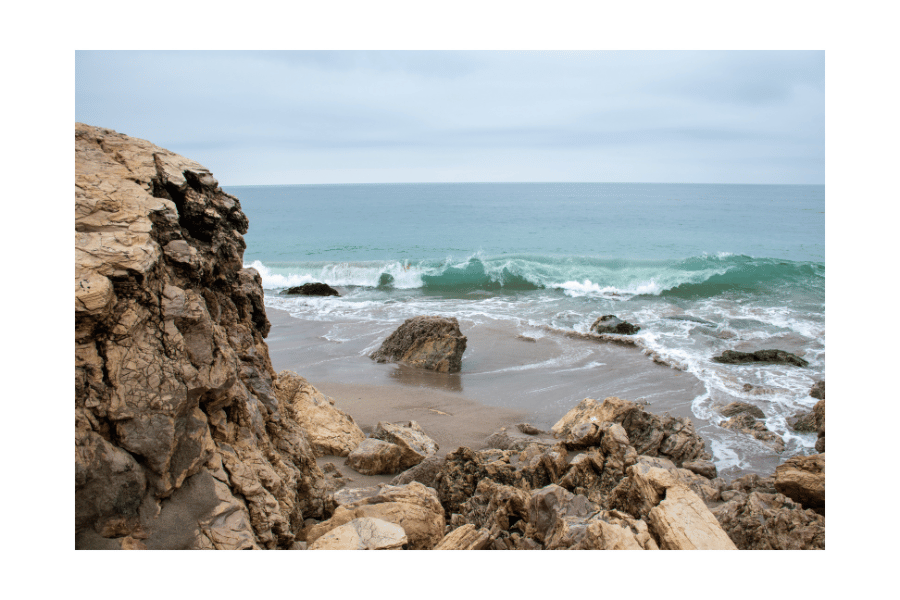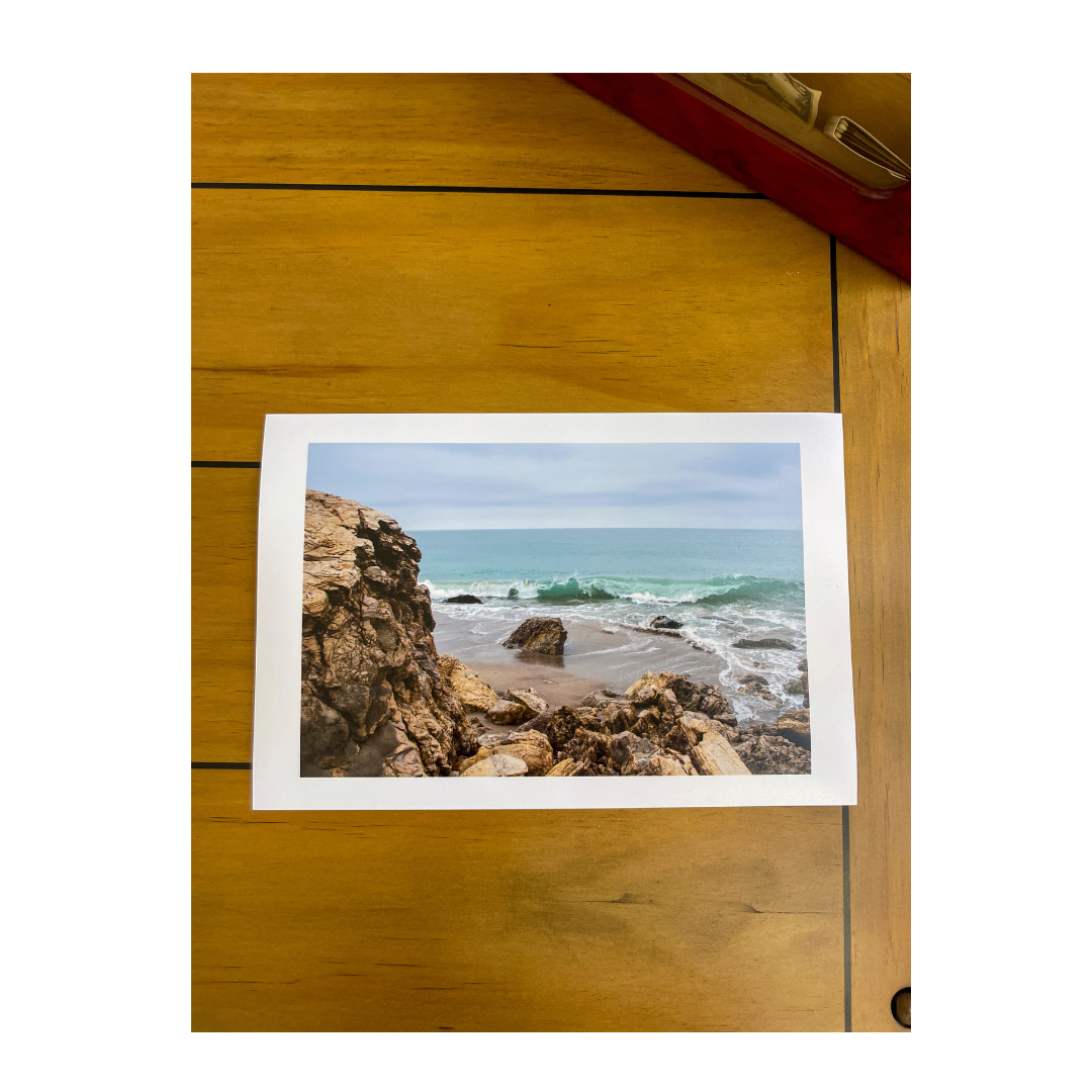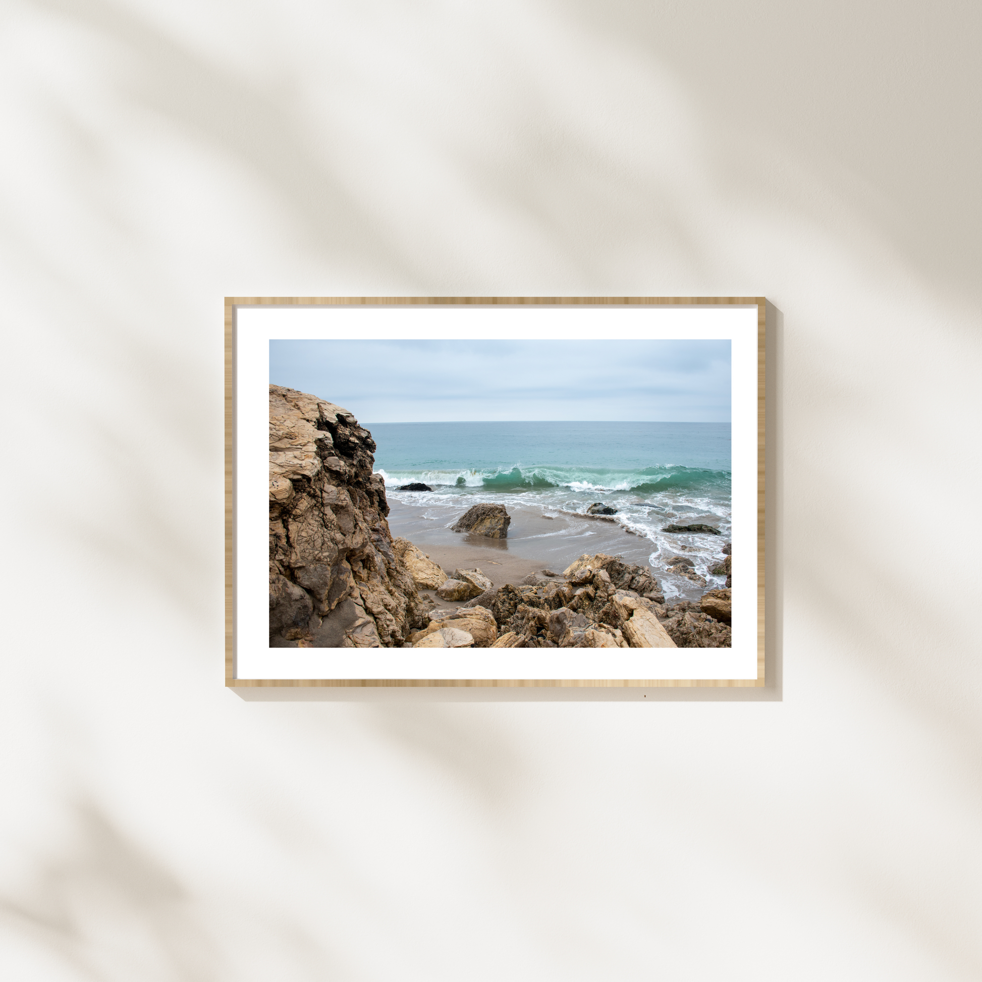 This photograph -- "Surrounded" -- lets you bring a piece of Malibu, California beaches home. It features waves curling around a rocky Malibu beach. This beach photo is a limited edition print, with only 250 available in each of two sizes (12"x8" and 18"x12"). Once they're gone, this print won't be sold again.